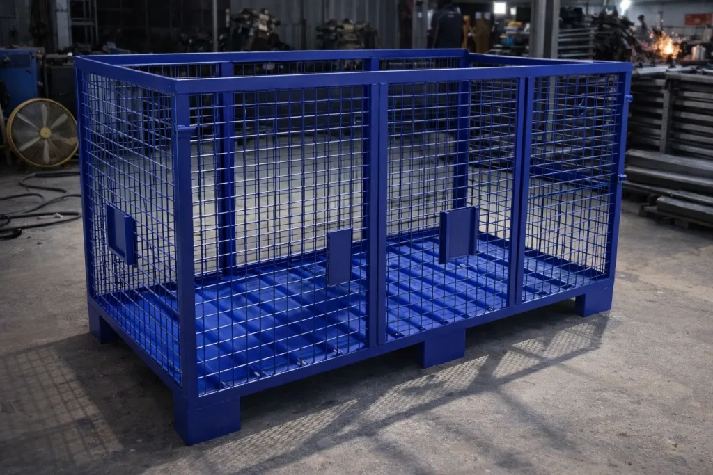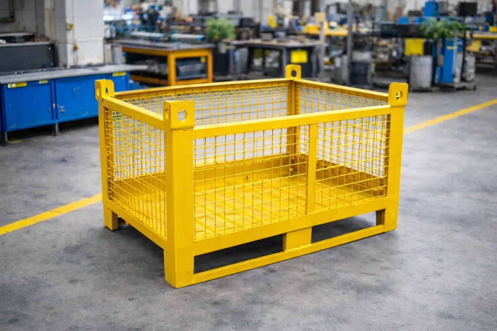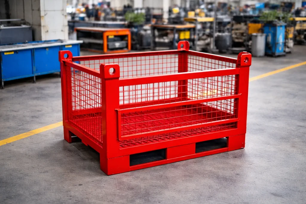 Çetindağ Endüstriyel tarafından üretilen telli metal taşıma kasaları depo, fabrika ve lojistik alanlarında ürün depolama ve taşıma işlemleri için kullanılan dayanıklı çelik konstrüksiyon kasalardır. Telli metal kasa sistemleri ağır yük taşıma kapasitesi sayesinde sanayi işletmelerinde güvenli ve düzenli depolama imkanı sağlar.